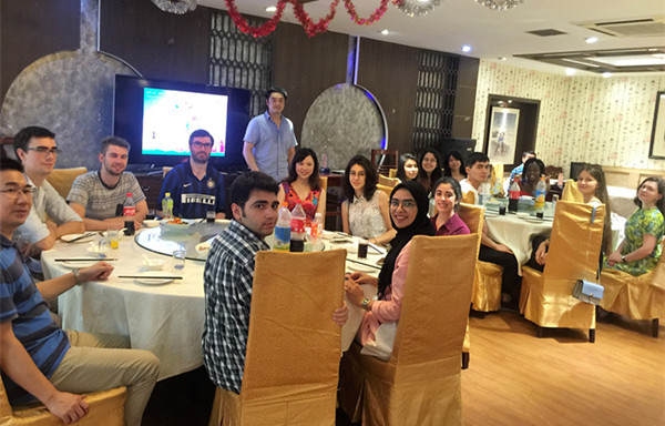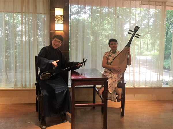 随后的茶艺表演和苏州评弹将欢送会的气氛推向了高潮。袅袅的水雾升起,清冽的茶香沁人心脾,大家仿若置身于一片竹林中,聚精会神地观赏着茶艺老师行云流水般的表演,并随着老师有模有样的品啜甘霖。苏州评弹的两位老师表演了一段经典的《白蛇传》,把许仙与白娘子的初次相遇娓娓道来,两位老师的一个眼神,一个手势,都蕴藏着水乡儿女独特的韵致,大家还饶有兴致地跟两位老师学起了如何用苏州话说“娘子”、“相公”、“夫人”和“官人”,欢送会上笑语连连。