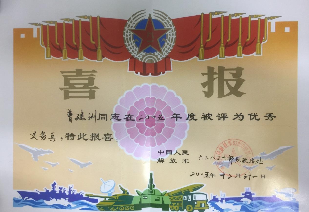 因服役期间表现优秀,曹建洲于2015年12月31日被中国人民解放军63836部队政治处评为2015年度优秀义务兵,特此报喜。