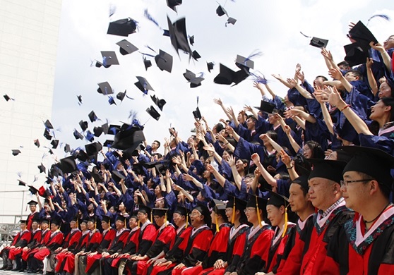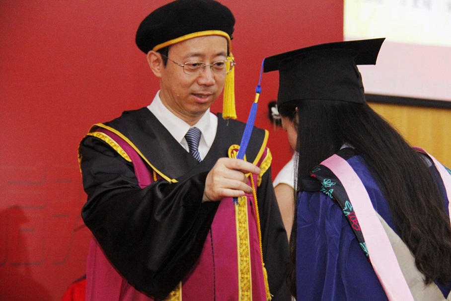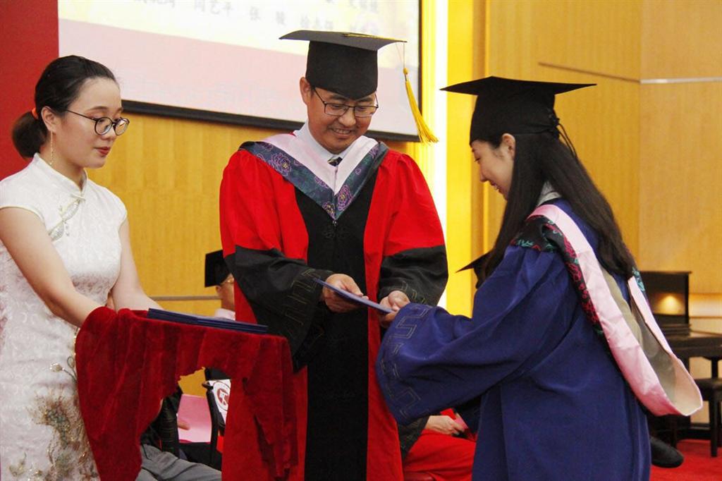 庄严而神圣的学位授予仪式最为激动人心,仪式由中文系姚蓉教授主持。在全体与会师生和家长的见证下,毕业生们依次上台,张童心副院长和曾军副院长分别宣读研究生和本科毕业生名单,张勇安院长为每位毕业生颁发毕业证、段勇副校长逐一为毕业生们拨穗授位,竺剑书记送上毕业贺信。