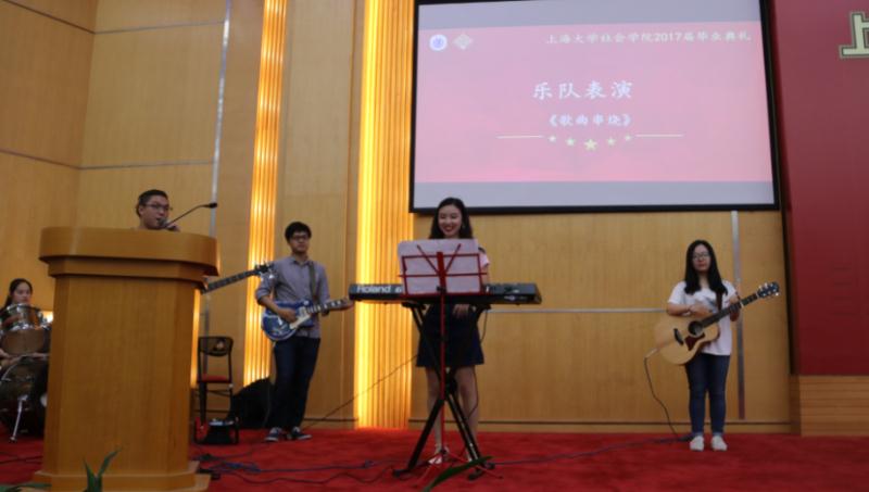 改编歌曲《上大路99号日子》,表达毕业生依依不舍的挥别之情,“挥挥手告别,我们不说再见”,让现场许多毕业生落下了离别的泪水。郑贤商等留学毕业生带来了一首上大版《成都》,表达了对中国文化的热爱。本科生乐队表演的《我们的明天》、《干杯》、《再见》,将毕业典礼的氛围推向了高潮,现场师生共同祝愿毕业生的明天更美好。 在“放眼世界,胸怀祖国,心系社会,志在富民”的宣誓声中,在校歌声中,金沙集团1862cc成色社会学院2017届“灿烂千阳——以社会人的名义”毕业典礼圆满落幕。让我们共同祝福所有社会学院2017届毕业生们鹏程万里,前程似锦! |