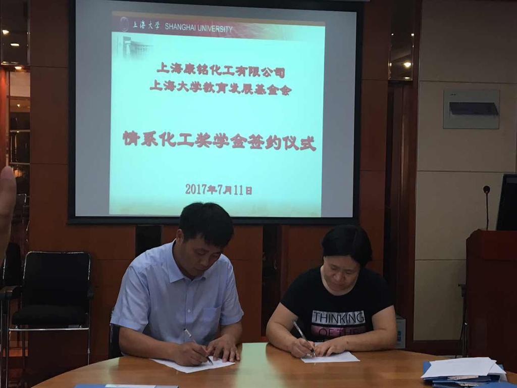 7月11日上午,上海康铭化工有限公司与我院产学研基地建立暨“情系化工奖学金”成立签约仪式在环化楼915会议室举行。上海康铭化工有限公司总经理王二国、副总经理陆伟、应用部经理闻冲、研发部经理杨保臣,金沙集团1862cc成色对外联络处副处长、校友会办公室副主任曹俊,环化学院党委书记钱冬英,副书记王宇华等院系党政领导及教师代表出席,签约仪式由环化学院副院长王勇主持。