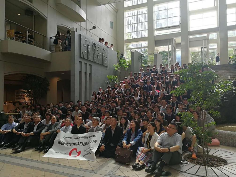 14日下午,代表团来到了"学术与体育兼优"的中京大学,中京大学校长安村仁志先生致词,向访问团表示了欢迎,并介绍了中京大学的基本情况,中日两方的学生和老师进行了分组自主交谈,同学们交流的话题广泛丰富,从互相介绍到爱好分享,从生活习惯到文化性格。与同龄人的交流也使同学们对日本年轻人生活与文化加深了了解。
