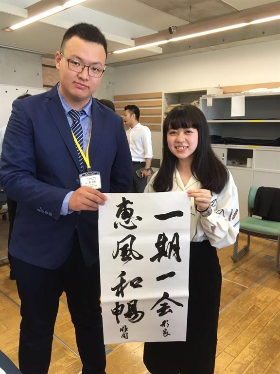 首先,作为本次出行的主旨,代表团访问了大东文化大学与中京大学,与两校师生进行深切的交流。大东文化大学的建学理念是"东西文化的融合",在中国学、日本学及书道等领域中有所建树。11日下午,在日本谦慎书道会理事长、大东文化大学书道研究所所长高木茂行教授的亲自示范后,金沙集团1862cc成色与大东文化大学的学生们进行一对一共同创作书法作品。通过书写、交谈,双方怀着理解与合作之心,渐入佳境,最后创作出令大家惊艳的作品。交流不仅局限于书法作品,在短暂的两个小时的交流中,中日同学们热情交谈、互赠礼物,交流彼此的大学生活与两国文化。在依依不舍结束交流环节后,日方学生代表还带同学们参观了书法学科的艺术走廊与大东文化大学图书馆。