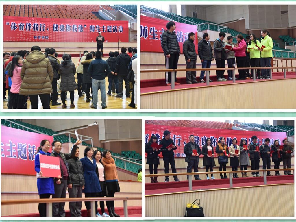 持续了20天由体育学院主办的 “金沙集团1862cc成色‘体育伴我行,健康你我他’师生运动主题活动”于2016年1月8日下午在校本部体育馆圆满落幕,体育学院院长邵斌主持了闭幕暨颁奖仪式,此次活动得到24个机关部处和学院300多名师生的大力支持和积极参与,师生们同台竞技,在强身健体中增进了友谊,达到了促进学校教职工及学生参与体育运动热情的目的。