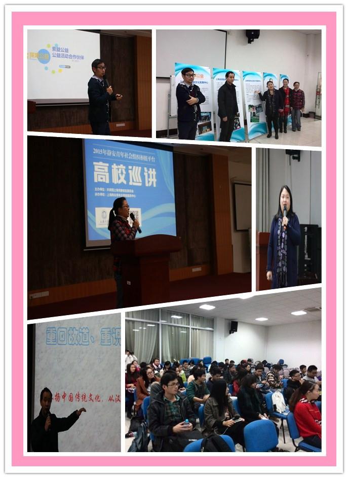 12月10日晚18:30在南区308举办了2015年静安区青年社会组织枢纽平台“创益说”高校巡讲会,本次活动由校团委和静安区团委共同主办,校青年志愿者协会承办。静安区团委青年社会工作部部长王彦、静安区政协常委、全国青联常委、上海益优青年中心张宁等5位优秀NGO青年社会组织负责人、校团委副书记沈青松以及各院系志愿者团队、社团的同学一起参加了本次宣讲会。