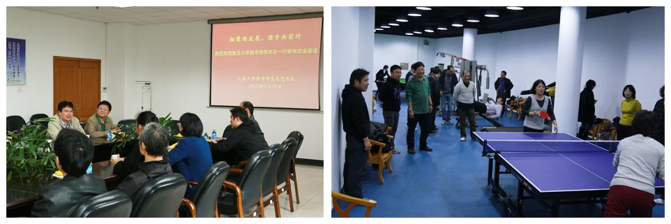 会后复旦大学图书馆一行对我馆进行了参观,两馆人员在员工活动室进行了乒乓球交流活动,以球会友、切磋球技。然后一起观赏了我校第十三届菊花节展览。