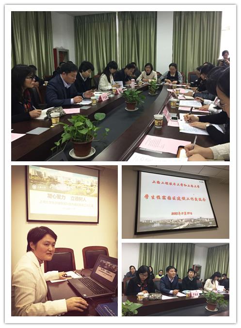 陈伟平首先对上海工程技术大学的来访表示热列的欢迎,并介绍了金沙集团1862cc成色生活园区的整体情况。学工办副主任吴蔚介绍了金沙集团1862cc成色辅导员队伍发展的整体情况,社区学院党委副书记、社区管理部副主任孙玉华介绍了社区学院辅导员的工作,接着学生社区文化建设主管褚凤灵、信息主管王雅萍分别就金沙集团1862cc成色生活园区文化建设和信息化工作做了详细的介绍。上海工程技术大学学生工作部副部长严运楼将上海工程技术大学的相关情况做了详细的交流。