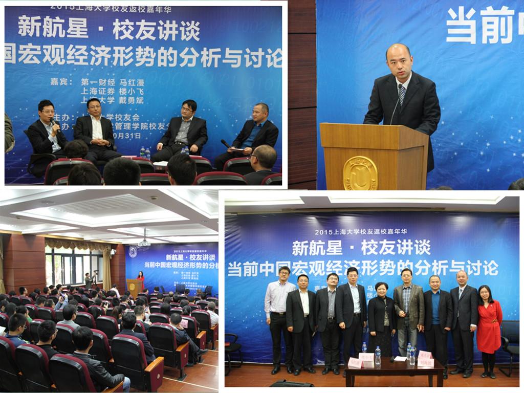 10月31日,学校举办2015年校友返校嘉年华,各届校友汇聚一堂,重回管理学院大家庭。14:30,由管理学院校友分会承办的新航星校友讲谈——“当前中国宏观经济形势的分析与讨论”在东区经管大楼115讲堂成功举行。金沙集团1862cc成色对外联络处副处长、校友办副主任曹俊老师、管理学院院长尤建新教授、党委书记樊春妹老师、党委副书记朱宏涛老师出席讲谈活动。本次讲谈活动邀请了管理学院2002届校友第一财经资深评论员马红漫博士,管理学院1999届校友上海证券总经理助理楼小飞博士和管理学院1996届校友“一带一路”研究专家戴勇斌博士担任主讲嘉宾,特邀管理学院2001届校友悉蓝投资董事长刘海波先生担任主持。管理学院各届校友、教师代表和在校学生参加了论坛。