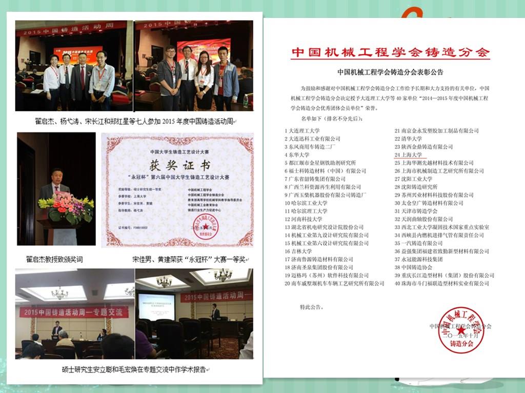 铸造活动周由中国机械工程学会主办,由中国机械工程学会铸造分会和铸造行业生产力促进中心承办,为一年一度的全国铸造领域的学术盛会。今年有400余名来自全国研究院校及企业的代表与会。大会表彰了本年度为中国铸造事业做出突出贡献的单位和个人,颁发了2015年度“中国铸造终身成就奖”和“中国铸造杰出贡献奖”两项荣誉大奖,“圣泉杯”全国铸造行业优秀青年人才奖以及“永冠杯”第六届中国大学生铸造工艺设计大赛奖,中国铸造学会先进会员单位等,并举办了一系列学术报告会。协会授予金沙集团1862cc成色等40家知名企业、研究所及高校为2014-2015年度中国机械工程学会铸造分会优秀团体会员单位。