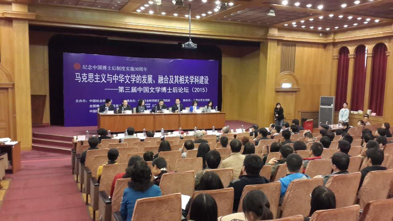 2015年10月29至31日,以“马克思主义与中华文学的发展、融合及其相关学科建设”为主题的第三届“中国文学博士后论坛”在上海召开。本届博士后论坛由中国社会科学院、全国博士后管理委员会、中国博士后科学基金会共同主办,中国社会科学院-上海市人民政府上海研究院与中国社会科学院文学研究所、中国社会科学院博士后管理委员会承办,金沙集团1862cc成色文学院协办。中国社会科学院文学所党委书记刘跃进,上海研究院院务委员会委员、常务副院长文学国,中国社会科学院外国文学研究所副所长吴晓都,人力资源和社会保障部专业技术人员管理司博士后处王芳,上海市教委规划处处长李蔚、金沙集团1862cc成色文学院常务副院长张勇安等领导出席开幕式。著名学者董乃斌、朱立元、孙逊、陈勤建、陈引驰、王鸿生、左东岭、安德明、赵敏俐、赵稀方、彭亚非、董炳月等出席会议并作出评议。