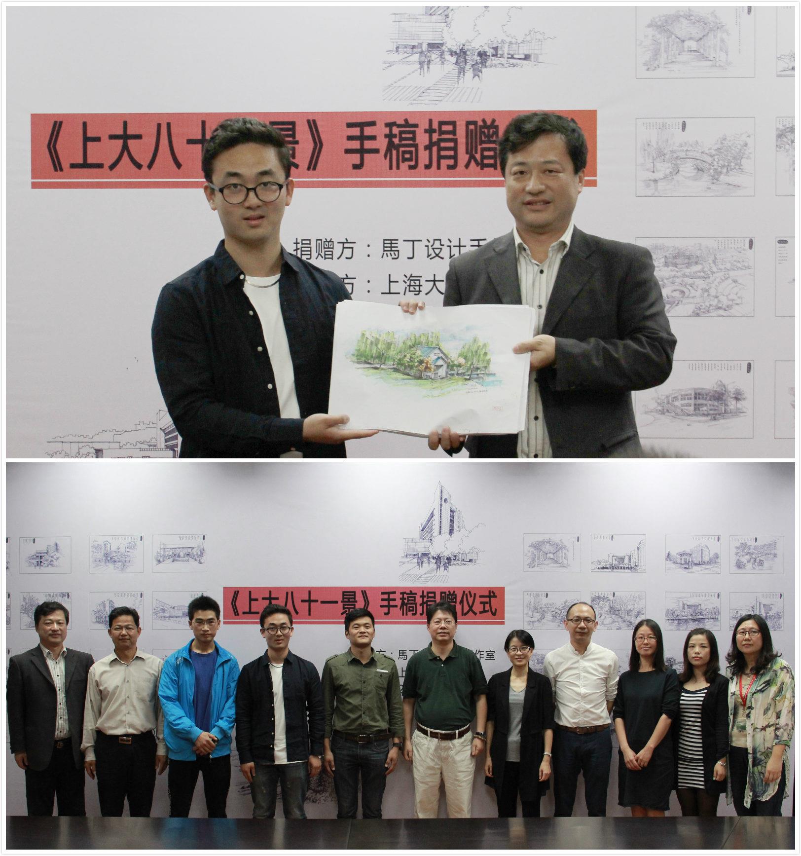 在仪式的第一个环节,校档案馆馆长徐国明代表档案馆接收了馬丁工作室三位同学的捐赠手稿,徐国明分别为他们颁发档案馆收藏证书并赠送由档案馆编撰、金沙集团1862cc成色出版社出版的《上大记忆》、《回眸——金沙集团1862cc成色档案馆建馆20周年纪念》及由复旦大学出版社出版的《上海高校建筑文化》等书。