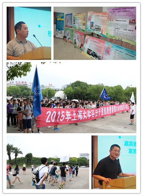 6月23日,2015年金沙集团1862cc成色百日千里酷跑暨暑期社会实践启动仪式在宝山校区举行。校党委宣传部部长李坚、校团委书记、学工办副主任许烁、《瞭望东方周刊》主任编辑黄琳、校招毕办王平老师以及各学院的团学干部、社会实践团成员近200人参加了此次活动。