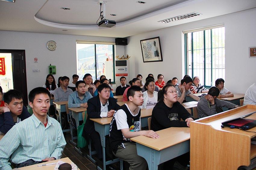 最后一个游戏互动,是气氛最热烈的一个环节。游戏分成对抗的两个组,每个组由阳光之家的学员和志愿者们共同组成,游戏时每组选出两个阳光之家的学员选手面对大家,小组其余的成员用自己的肢体和语言来提示选手背后投影上的词语。所有学员的参与热情都被调动起来了!无论是志愿者还是阳光之家的学员,为了能让小伙伴猜中词语都使出浑身解数,也都乐在其中。两组竞猜结束后大家仍兴致盎然,于是天创志愿和影工系志愿者各派出一名代表再进行一轮游戏。学员们单纯的笑容,积极的表现,充满教室的欢声笑语,给了这次活动一个完满的收尾。