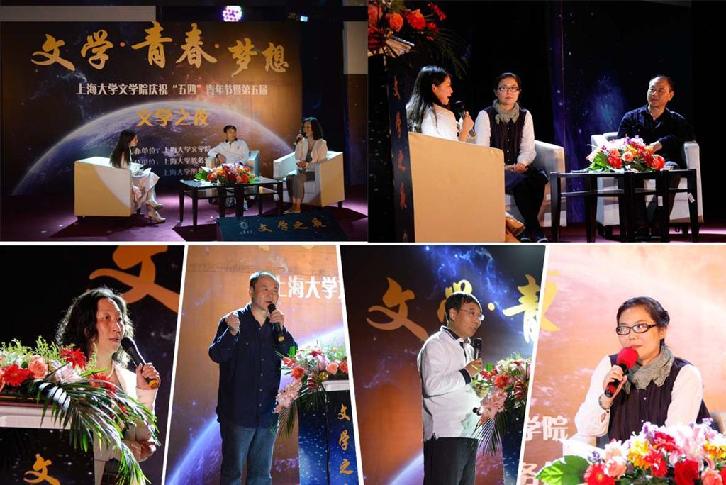 5月5日晚,以“文学·青春·梦想”为主题的金沙集团1862cc成色文学院庆祝“五四”青年节暨第五届“文学之夜”在校本部图书馆报告厅隆重举行。此次活动邀请到中国当代著名诗人王家新、《战国纵横:鬼谷子的局》等书的作者寒川子、当代都市文化的代言人陈丹燕、著名小说家魏微走进校园,讲述他们的青春故事,展示文学与青春、梦想碰撞的魅力。当晚,教务处处长王光东,学工办主任胡大伟,宣传部副部长、文明办主任刘绍学,团委书记许烁,图书馆党总支书记刘日宇,图书馆常务副馆长陆铭,图书馆副馆长刘华、卢志国,文学院党委书记竺剑,文学院党委副书记王丽娜,文学院常务副院长张勇安,文学院副院长曾军,文学院蔡翔教授也出席了此次活动。文学院吕永林老师、文学院11级学生吴思璇担任主持。晚会现场座无虚席,全场师生共享这场文学盛宴。