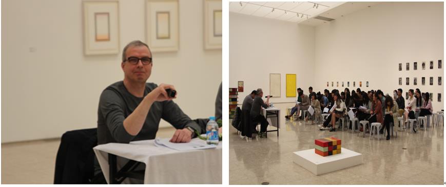 讲座伊始,米舍(Michael Growe)首先提出他的创作理念:“当今有太多其他的方法可以产生图画,我为何还要继续画画呢?”然后米舍(Michael Growe)从色彩的躯体SHEY、色彩和空间、绘画是一种放大和强化自我意识的手段,从这三个方面来具体阐释他的创作理念。接着米舍(Michael Growe)就美术学院展厅正在展览的相关作品进行了作品介绍,深入地向在座地同学剖析了自己地作品创作特征。