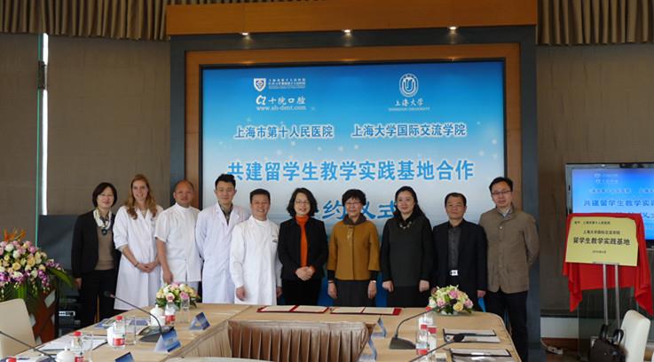 王海燕书记和范理宏副书记代表双方单位签署了共建协议,并为第十人民医院“留学生教学实践基地”揭牌。十院口腔科汪饶饶主任和我院杨静副院长分别向促成此次共建签约的双方代表和工作人员表达了谢意,并期待通过双方的共同努力,进一步加深合作交流,为我校留学生提供一个优质的教学实践平台,建设一个留学生了解中国社会和中国人民的窗口,一个向世界展示中国医疗水平和医务人员面貌的窗口。