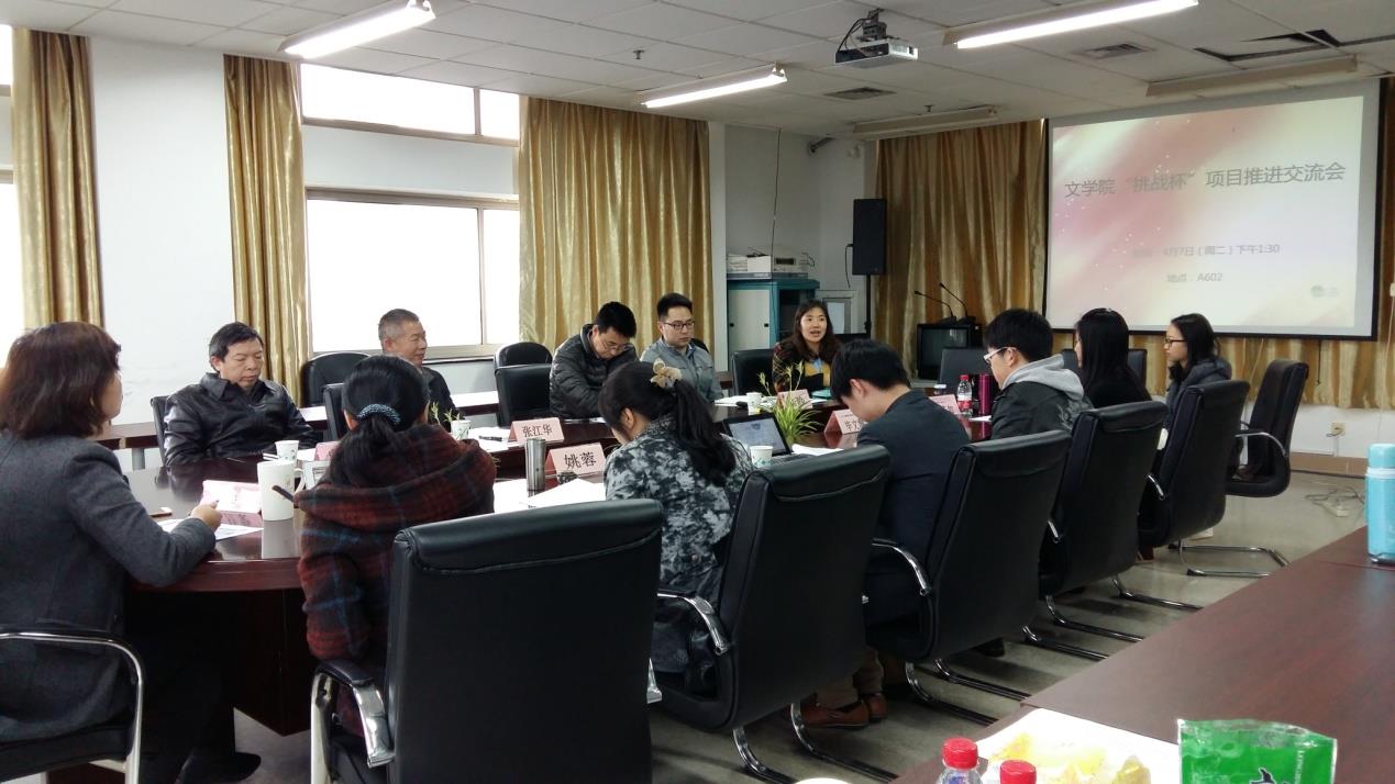 在金沙集团1862cc成色第十届“自强杯”大学生课外学术科技作品竞赛暨第十四届“挑战杯”全国竞赛学院选拔工作完成之际,为了给“挑战杯”申报团队提供针对性指导,更好地推进项目实施,文学院团委于4月7日下午,在宝山校区A602组织召开了“文学院‘挑战杯’项目推进交流会”。校团委副书记陆静、社会学院张江华教授莅临指导,文学院常务副院长张勇安、党委副书记王丽娜、团委书记丁佳蒙,三个参赛项目的指导教师文学院副院长曾军和姚蓉、罗小茗老师,以及项目团队学生代表出席了本次会议。会议由文学院党委副书记王丽娜主持。