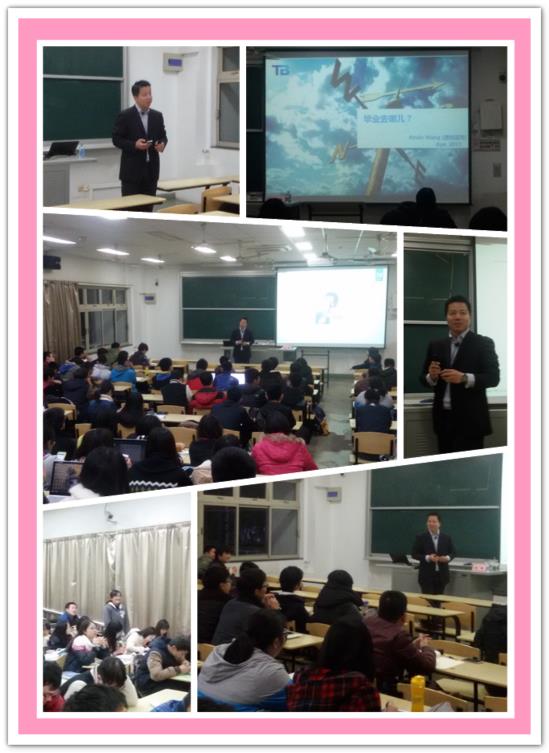4月7日晚6:00,钱伟长学院职业导航月讲座之“毕业去哪儿——生涯规划”在DJ103教室成功举行。唐柏咨询公司副总裁王海先生(Kevin Wang)应邀进行主题报告。钱伟长学院直属党总支副书记韦淑珍、辅导员阮杜娟和2014级全体学生出席本次报告。