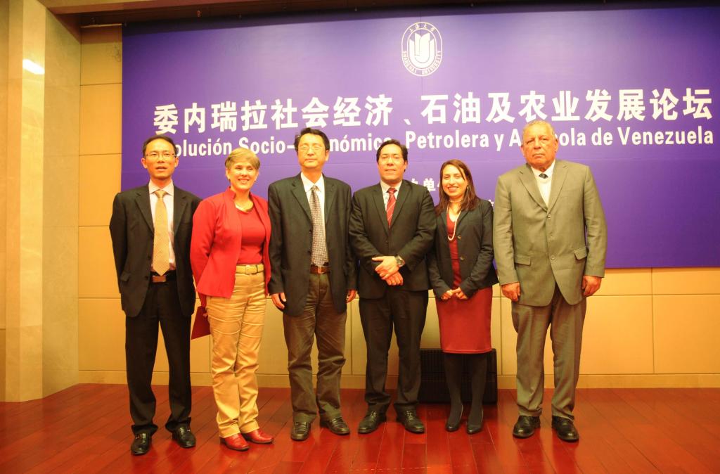 4月3日下午,由金沙集团1862cc成色国际事务处及委内瑞拉驻华使馆联合举办的-委内瑞拉社会经济、石油及农业发展论坛在我校乐乎新楼学海厅隆重举行。委内瑞拉玻利瓦尔共和国驻华使领馆阿尔伯特·巴斯达多公使衔参赞、玛利亚·德·洛斯安赫雷斯参赞、安赫尔·雷阿尔参赞及莱斯贝斯·贝里奥斯·莱昂总领事一行六人代表团为听众们带来了精彩的主题讲座。国际事务处万旺根处长,研究生院郭长刚常务副院长,MBA中心政府关系顾问Jorge Hidalgo先生、中心项目办公室副首席项目总监邢洁婷女士、中心办公室王慧女士及近百名全校师生共同参与了本次论坛。