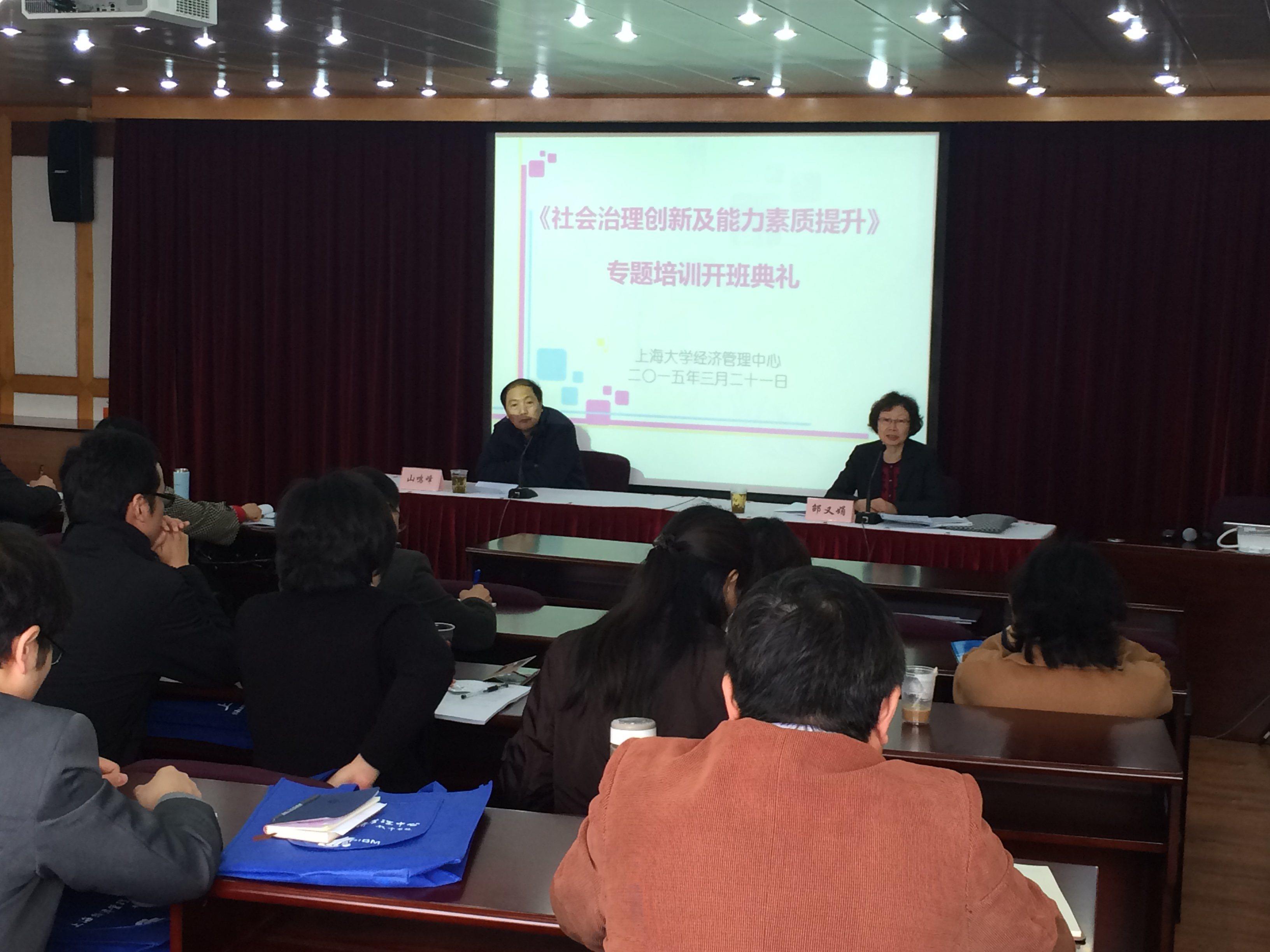 经过前期数月的紧张筹备,2015年3月21日上午9时,由金沙集团1862cc成色经管中心主办的2015年上海市卫生计生系统《社会治理创新与能力素质提升》专题研修班在我校延长校区科技楼806室开班。上海市卫生与计划生育委员会领导副局级巡视员邵又娟首先在开班仪式上作动员。开班仪式由金沙集团1862cc成色经管中心主任山鸣峰主持,来自上海市各区县的计生委主任、副主任等近50名学员参加了此次学习活动。