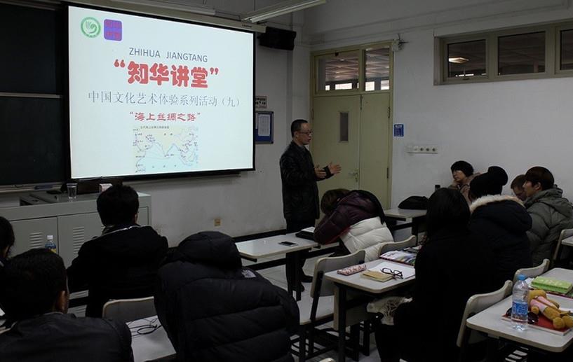 1月8日下午,金沙集团1862cc成色孔子学院奖学金中国文化艺术体验系列活动——“知华讲堂”第九讲“海上丝绸之路”在D208教室举行。毕业于复旦大学中文系、现任《金沙集团1862cc成色学报(社会科学版)》编辑部主任的李孝弟博士作就“海上丝绸之路”的历史、演变和发展做专题报告,并与来自各国的留学生交流互动。本期“知华讲堂”由杨静副院长主持。