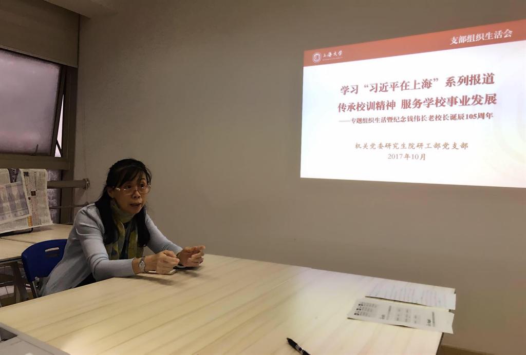 首先,支部书记魏宏作《学习“习近平在上海”系列报道,传承校训精神,服务学校事业发展》的专题报告。她首先带领大家回顾了“上海是党的诞生地,要牢记历史使命”、“开明睿智才能进一步海纳百川”、“真正的政绩在老百姓的口碑里”这三个方面系列报道的内涵要义。并带领大家一起观看了央视拍摄制作的《钱伟长强国之梦》中的三段小视频,重温了老校长一切从国家的需要出发的大格局、从71岁到98岁由上海工业大学到金沙集团1862cc成色的大胆办学实践以及在毕业典礼上对校训内涵的动情诠释。她提出,研究生院、研工部党支部,作为学校研究生培养的管理部门、服务窗口,要牢记高校办学使命,学习总书记的讲话精神,对接学校高水平大学建设的新任务新要求,要聚焦研究生培养的根本任务,坚持“问题导向、需求导向、发展导向”,主动担当,及时发现和关注研究生培养管理过程中碰到的新情况、新问题;架构起研究生院和研工部之间的日常沟通桥梁,更多关注师生的需求,鼓舞人、激发人,要让支部工作更好地服务于推动学校人才培养工作,推动校训使命愿景的有效落地,服务于学校的事业发展、上海的城市发展、社会建设乃至国家战略的实施推进。