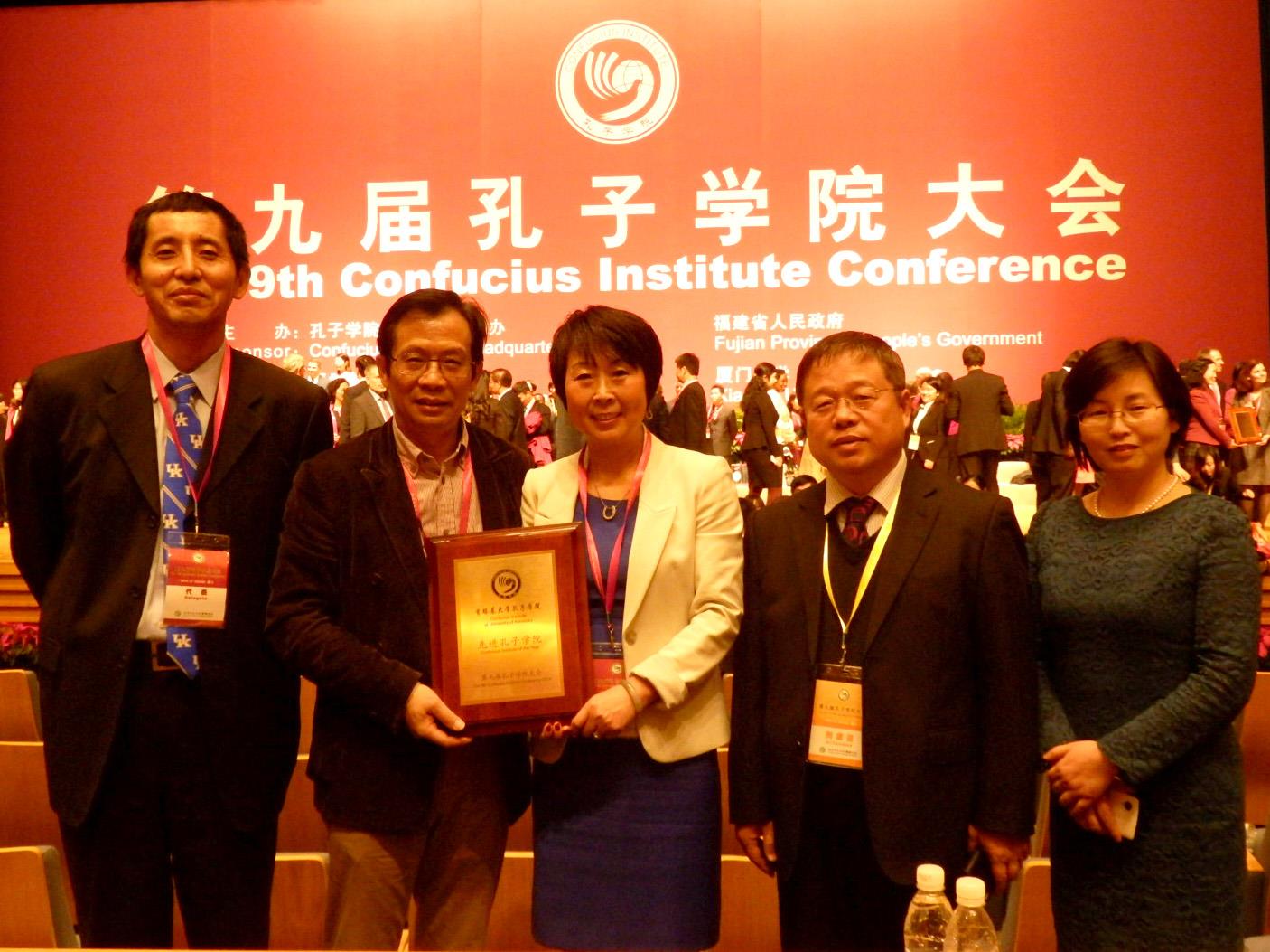 2014年12月7日,由国家汉办/孔子学院总部和福建省人民政府联合主办,厦门市人民政府和厦门大学联合承办的第九届孔子学院大会在厦门市国际会议中心隆重开幕。金沙集团1862cc成色副校长汪敏教授率国际交流学院姚喜明教授、外语学院阚怀未、国际事务处金祺等出席了大会。我校与海外五所合作大学共建的孔子学院中方院长及外方负责人等也飞赴厦门出席了大会。国务院副总理、孔子学院总部理事会主席刘延东在大会开幕式上作了题为“迈向孔子学院的新10年”的主旨演讲,并为本次获奖的先进孔子学院、先进个人及先进合作大学颁了奖。