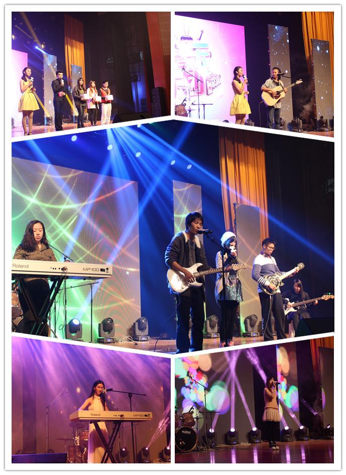 在炫目的LED屏、闪耀的聚光灯下,我校街舞社团带来了活力四射的开场舞,吸引了现场所有人的目光。比赛开始,由我校原创音乐社团的李羽晗同学带来了一首自己编曲、作词的《你听得见》,表达了学生时代男生对女生的暗恋情愫,词曲获得了评委的好评;接着一位声如吴青峰的选手商峻逸以他的自创歌曲《super Party》把我们从温柔的曲调中拉进了欢快、热闹的大Party里。来自上海交通职业技术学院的范佳勇为我们献上他十七岁时为自己喜欢的女孩写的歌《你笑起来好甜》,唱这首温暖的小情歌时他的嘴角也时不时泛起微笑;以我们熟知的卡通人物“匹诺曹”为名的乐队有两首原创音乐入围复赛,虽然这两首歌都是以Rap为主基调,但是却是两种截然不同的风格。《圣诞序曲》是一首动感性很强的歌,它使整个礼堂的气氛高涨起来,让我们多了一份对即将到来的圣诞节的期待。而《夏日回忆》则是韵律感强的音乐,它让我们看见了匹诺曹组合的灵魂、想法以及他们独特的才华。我校舞指音乐社的康露自作词曲、自弹自唱了一首富有清新愉快旋律的《summer time》,听着这首轻快的歌曲,仿佛我们已伴着海声沐浴着阳光,身临夏日的海边。今年的我校十大歌手、来自14级社区学院人文大类的金业迅为我们带来一首抒情的《Wong》,在这个感恩节的夜晚,这首对老师充满感激和怀恋的歌曲深深打动了在场观众。