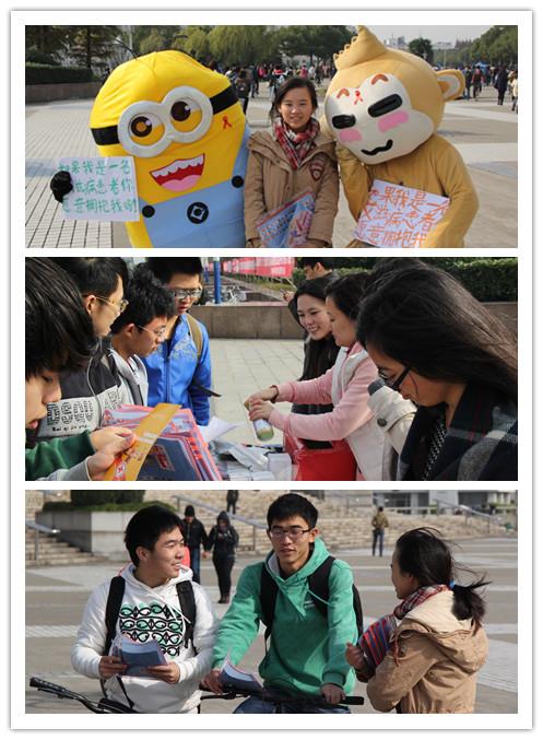 活动开始后,许多热心的同学前来咨询,有选择买下纪念品捐出爱心的,更有直接捐款表达慈善之心的同学。与上大学生的交流中,“蒲公英”团队志愿者们积极地向他们介绍和解说世界艾滋病的概况和趋势,引导着更多的同学关注艾滋,奉献爱心。同学们簇拥着渴望更加了解艾滋病相关知识的身影,在寒冷的秋冬天里蔓延出一股温暖的力量,相信这股力量会传播得越来越广。