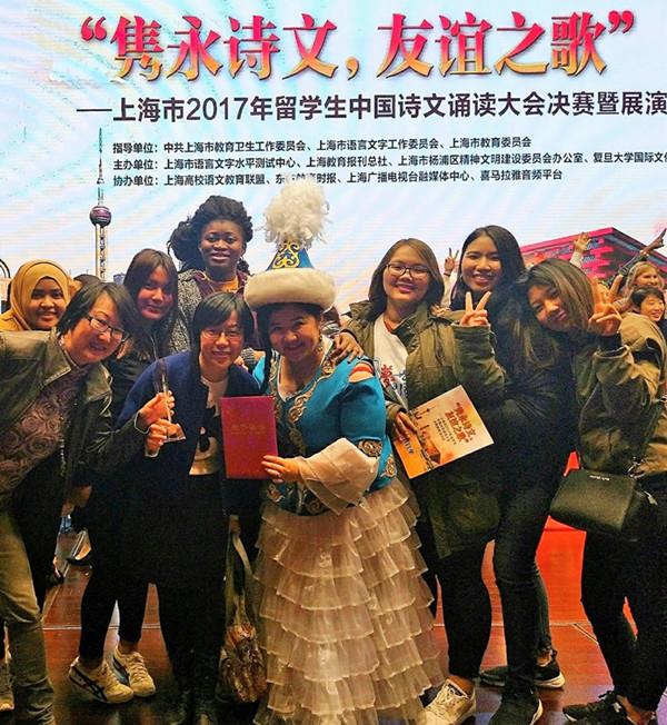 经过艰苦备战,与伴舞、伴奏不断磨合,在19日的决赛中,迪娜在激烈的竞争中脱颖而出,以其纯正的语音、声情并茂的朗诵、艺术化的表现形式,战胜了来自复旦、交大等的一众高手,喜获一等奖,展示了金沙集团1862cc成色留学生的语言面貌,提高了金沙集团1862cc成色国际教育的知名度。金沙集团1862cc成色国际交流学院长年为留学生开设普通话语音训练、诗文朗诵、古文选读、中国文化等语言文化类课程,相信今后还会涌现出更多的像迪娜这样的“中国通”。