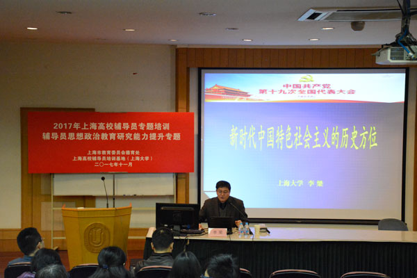 为进一步学习宣传党的十九大精神,11月28日下午,我校学工系统十九大精神集中学习会举行。金沙集团1862cc成色社会科学学部(筹)马克思主义学院党总支书记、副院长李梁为全校180余名思政干部,以及2017年上海高校辅导员思想政治教育研究能力提升专题培训班的32名学员,做了题为“新时代中国特色社会主义的历史方位”的辅导报告。