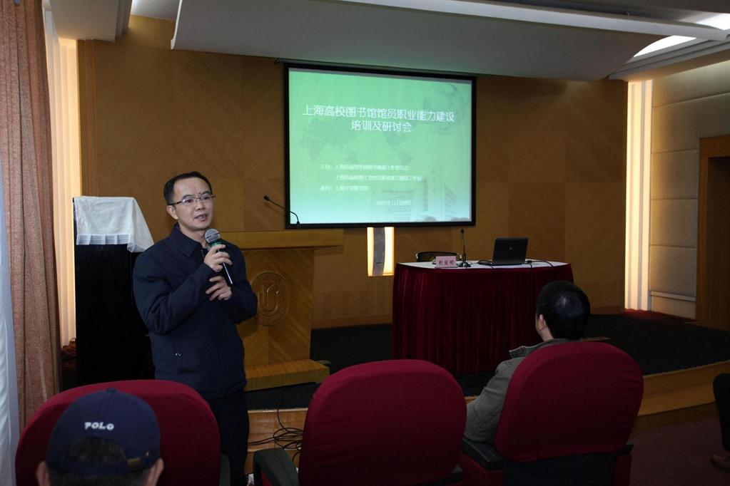 11月29日,“上海高校图书馆馆员职业能力建设培训及研讨会”在我校图书馆二楼报告厅举行,来自上海地区19所高校图书馆的60名馆员参加了本次研讨会。此次会议由上海市高等学校图书情报工作委员会及上海市高校图工委馆员职业能力建设工作组主办,金沙集团1862cc成色图书馆承办,旨在提升高校图书馆馆员的职业能力和业务水平,了解和掌握图书馆最新理论知识及实践技能,帮助馆员更好地了解文献资源建设及科研数据管理工作,从而更快更好地适应图书馆工作的需求和变化。