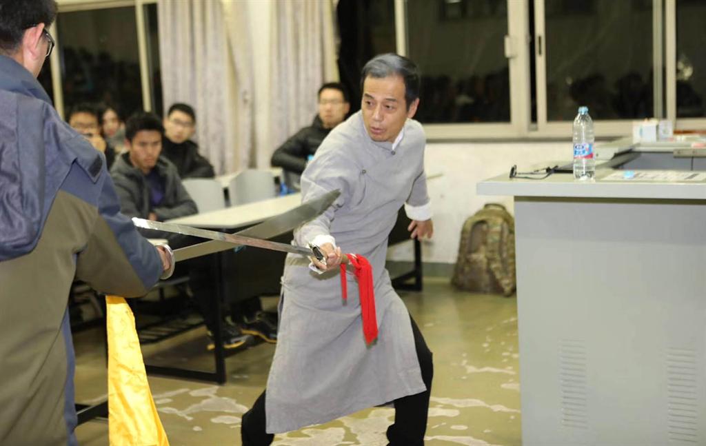 紧接着,马老师带领大家回顾了历史时空中的中国武术的面貌。他从“越女论剑”和“庄子说剑”开始,给同学们描绘了一幅中国古代剑术对决的生动“图景”:既有面对强敌从容不迫和淡定自如,也有“好妇”到“惧虎”的灵动转换,还有“后之以发,先之以至”的迅疾沉着。这让大家瞬间明白了古代的剑法原来是如此精妙,既不像武侠小说那般虚无缥缈,却又能在他的讲解和示范中豁然而得。他认为,如果说杜甫诗句中的“公孙大娘”和“峨眉道人”是武艺的“演练”,那么戚继光的《拳经》、程冲斗的《单刀法选》和吴殳的《手臂录》则是真正记录了古代武艺的“真意”。特别是,马老师现场为大家吟诵《拳经》和《单刀法选》以及《手臂录》中关于枪法的精辟注解,更用刚刚学会的闽南语吟诵了几段俞大猷《剑经》中对于棍法的解读,让同学们领略了中国武术历史上的“波澜壮阔”。特别是在技术展示环节,马老师和一位同学共同为大家演示了剑法之“击刺”和刀法之“劈削”,还有枪法之“封闭”、“颠提”、“闪赚”的技法,引来大家阵阵掌声。