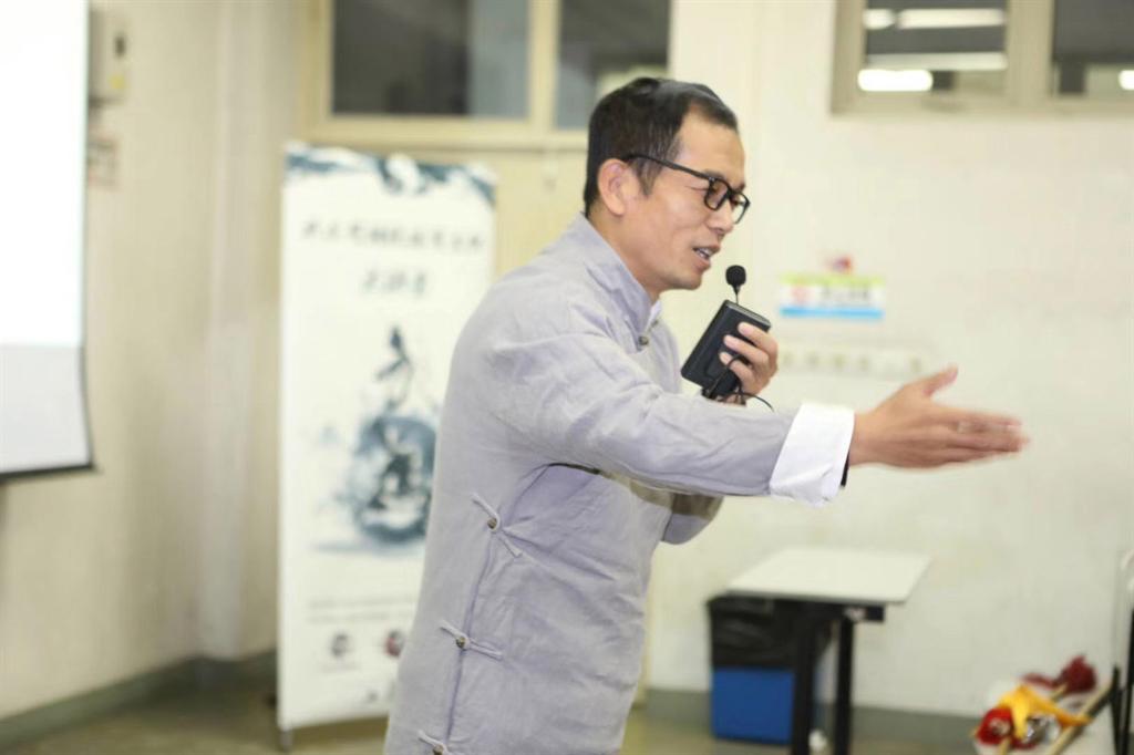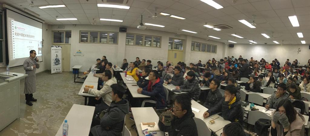 阶梯教室座无虚席,马文国老师戴一副黑边眼镜,穿一身灰色长衫,以典型的“民国先生”的风范现身会场。简单的介绍之后,讲座正式开始。马老师首先回顾了自己的上海之缘。今年是他博士毕业离开上海的第十个年头,而每次来到上海都有一种特殊的感动和温热,特别是能够在寒冷的冬日再次回到上海,走进上大的校园,和同学们一起分享自己每日沉浸之、疯魔之、研习之中华武艺,是一种幸福,一种甜蜜,一种感动,愿意和大家一起回到那一个让我们自豪不已而又肃然起敬的“武术的历史时空”。