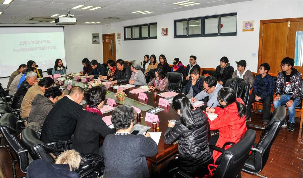 一流的大学要有一流的离退休工作,要实现离退休工作的转型就要有优质的平台让离退休老同志们彰显风采,要融于学校育人主旋律,成为大思政格局中的一个角色。2015年,我校第一批10名退休干部与法学院少数民族学生结对活动,以“爱的延续”为名在两年的时间取得了可喜的成效。因此,经过一段时间的筹备后,12月15日,在宝山校区的经管大楼420会议室,第二批11名退休干部与管理、机自学院11名少数民族学生进行了结对活动,参加此次结对仪式的有校关工委副主任陆群英、管理学院党委书记李伟、统战部副部长李青、学工办副主任汤琳夏、管理学院党委副书记朱宏涛、机自学院代表金建国、法学院党委副书记卢欣、“爱的延续”团队代表冯兆荣、丁佩莉;统战部民族联秘书长卢吉超;结对老师、结对学生等。活动由校关工委办公室秘书长余志龙主持。