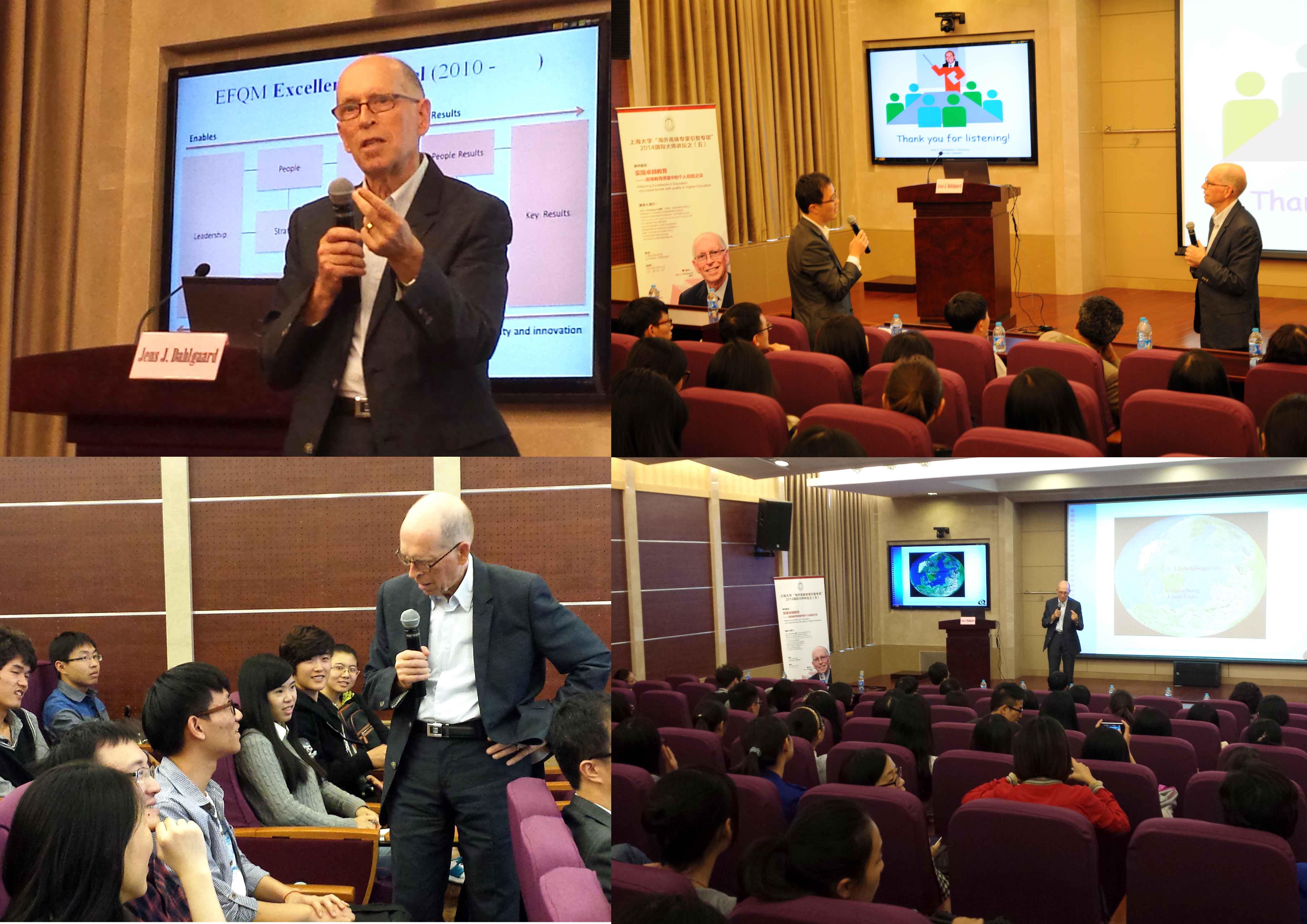 报告中,Jens J.Dahlgaard教授从EFQM卓越模型引入,深入浅出地为大家介绍了其对于学生与学校关系的理解,认为学生对于学校来说,应该是像老师一样作为学校人力的一部分,而不是作为学校的产品或是顾客。更正确地对待学生,不仅仅能够提高学生的主动性、参与性,更能够在高等教育中实现卓越教育。但是,有时候由于认识不够全面或者过于注重教育质量指标反而会成为卓越教育的障碍。Jens J.Dahlgaard教授引用安徒生童话——“皇帝的新衣”为同学们进行了形象地解释。最后Jens J.Dahlgaard教授通过介绍其在台湾某大学的一份课堂调查报告,通俗易懂地说明了学生在行动和想法上的差距,向我们阐述了实现卓越教育过程中全面质量管理的目标和需要解决的问题。Jens J.Dahlgarrd教授的讲座,以其幽默深邃的语言,体察入微的阅历深深吸引了在座师生。最后的提问环节,Jens J.Dahlgaard教授与在场的师生进行了热烈的交流讨论,耐心详尽地解答了每位老师和同学提出的问题,使大家对于高等教育中的卓越教育有了更多更新的认知。