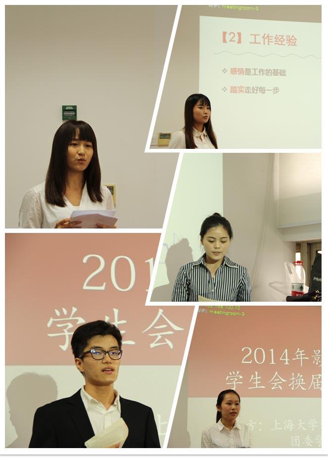 2014年9月12日下午三点整在金沙集团1862cc成色宝山校区a楼北区4003会议室举行了金沙集团1862cc成色影视学院学生会2014-2015届主席团换届大会。出席本次活动的有影视学院团委书记严瑶老师,各班班长、团支书,原影院学生会主席团成员,二十多名学生会骨干以及八名经前期推选参与主席团竞选的候选人组成。