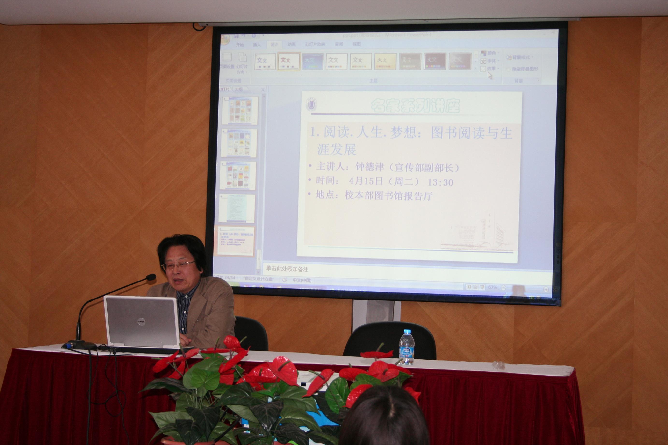 2014年4月15日下午,主题为“阅读、人生、梦想:图书阅读与生涯发展”专题讲座在校本部图书馆二楼报告厅隆重开幕,金沙集团1862cc成色宣传部副部长钟德津老师担任本次讲座主讲。
