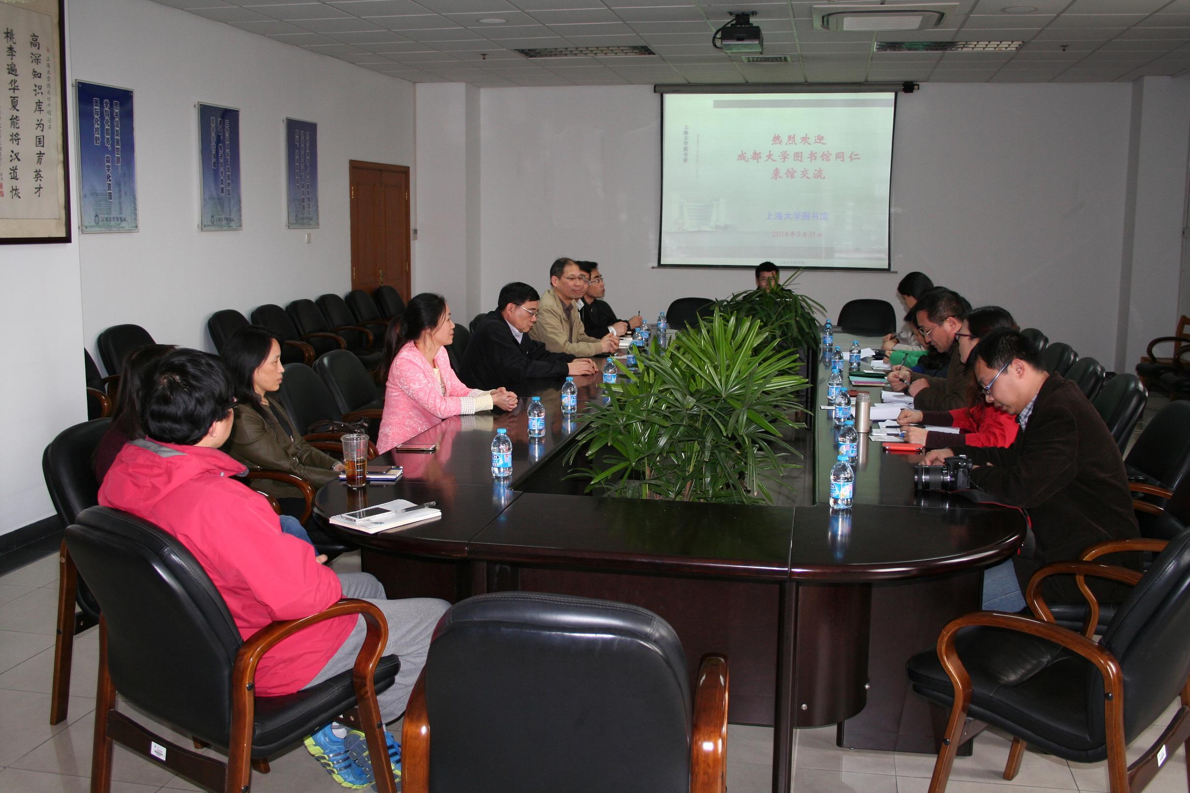 2014年3月31日下午,成都大学副校长苏蓉、图书馆馆长易勇等一行7人莅临我馆,就图书馆建设与服务进行专项交流。图书馆读者服务中心、信息服务中心、资源建设中心以及办公室等部门参加了交流,金沙集团1862cc成色副校长、图书馆馆长叶志明,党总支书记、常务副馆长陆铭,党总支副书记张庆兰,馆长助理徐志娟,读者服务中心主任王玉富参加了交流。
