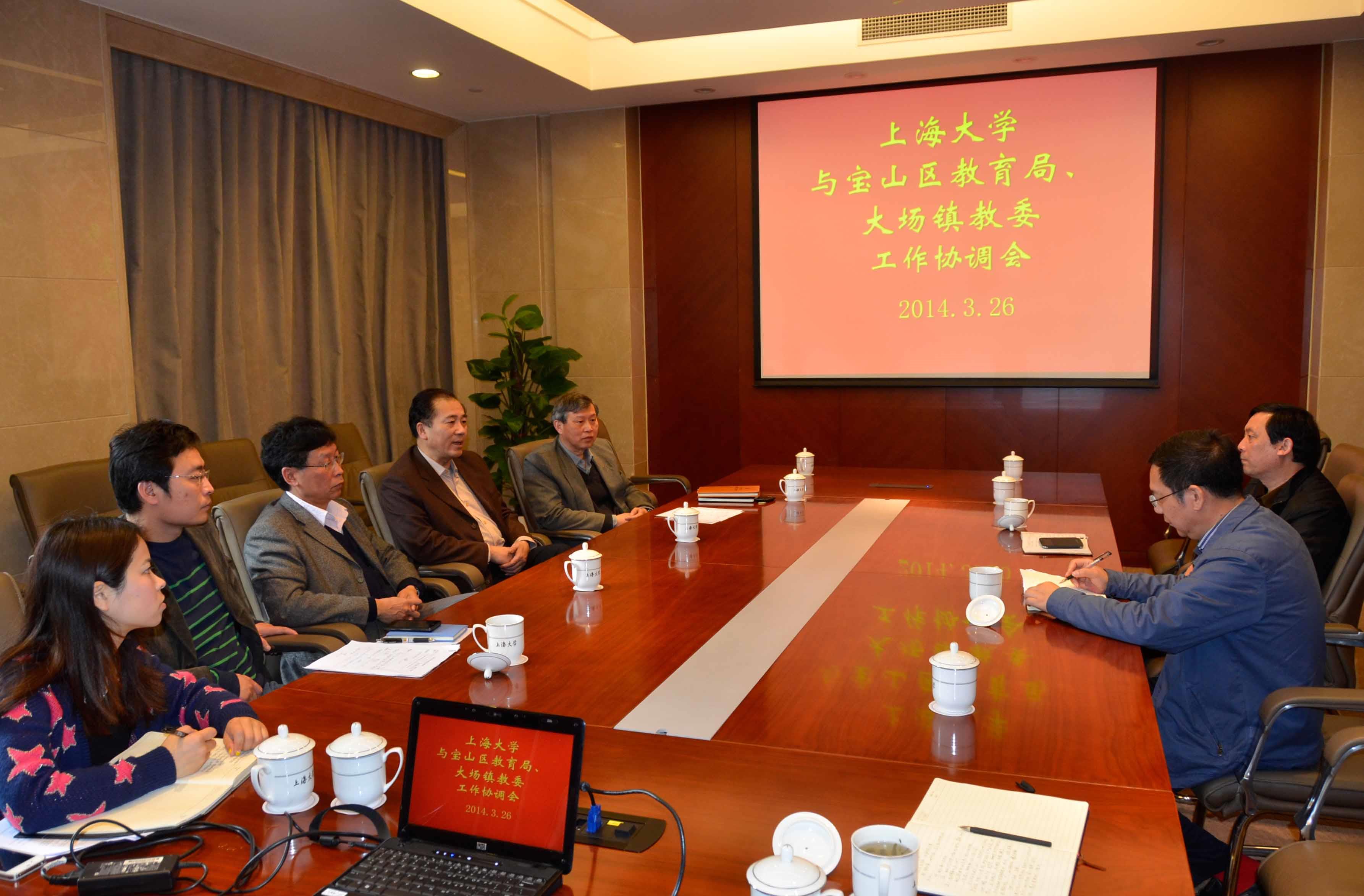 3月26日上午9点,金沙集团1862cc成色与宝山区教育局、大场镇教委在校本部乐乎新楼海纳厅举行工作会谈。校党委副书记、纪委书记、校工会主席忻平,宝山区教育局副局长陆荣林,大场镇教委主任左忠明,校办副主任吴英俊,校本部基建总指挥、原校工会主席薛志良出席了会议。