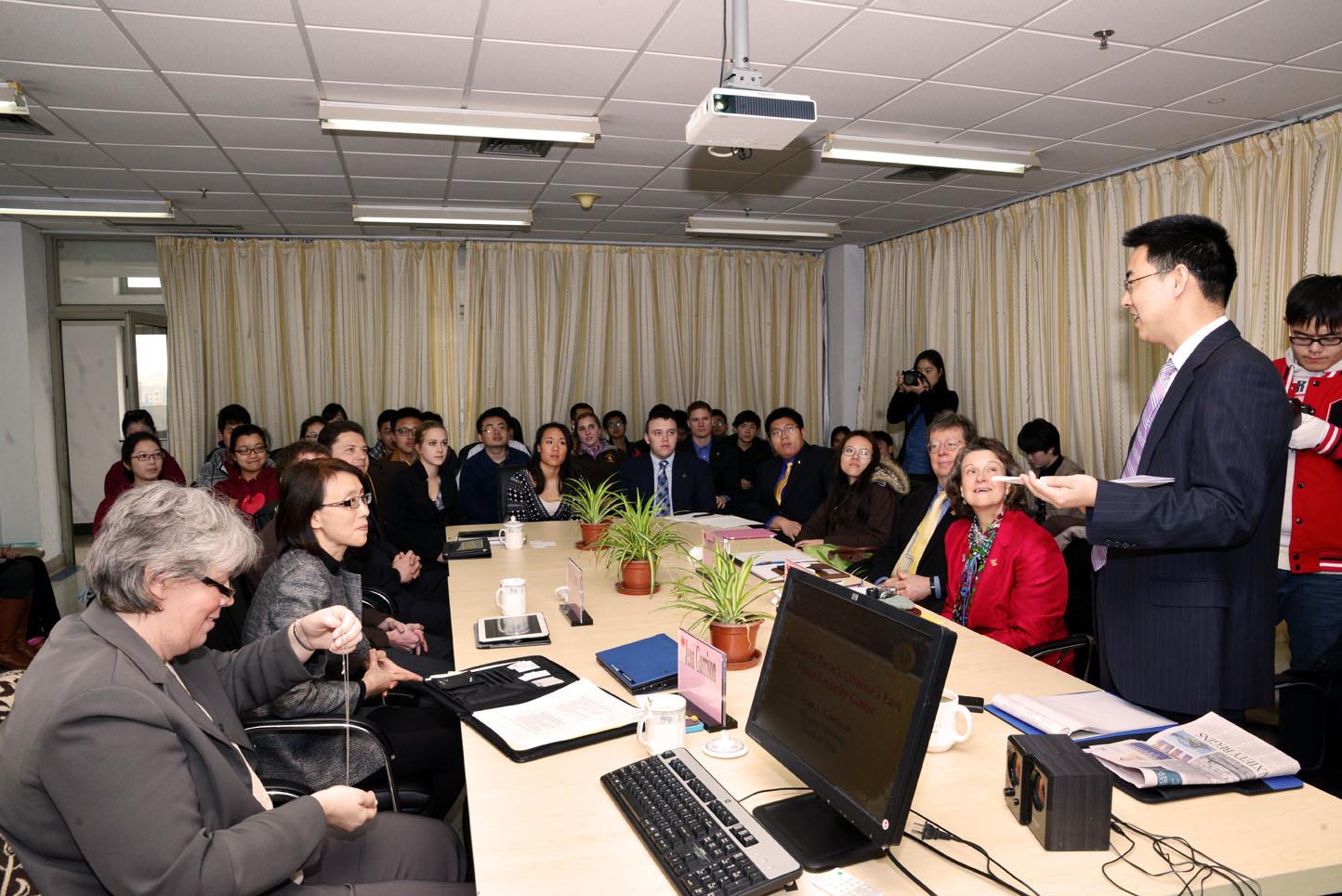 上午的会谈结束后,Jean Carrison教授做了Obama’s East Asia Policy的精彩演讲。讲座由张勇安教授主持,来自怀俄明大学的外国学生、孔子学院留学生、研究生院、人才学院的五十余名学生参加了此次讲座并进行了热烈的讨论。Jean Garrison 是美国怀俄明大学国际关系研究中心主任,对国际关系有着独到而深刻的见解,她曾经在金沙集团1862cc成色做过数次讲座,每次讲座都受到学生的热烈欢迎,此次讲座也不例外。本次讲座Garrison教授从中美建交史开始讲起,涉及到如1971年周恩来总理与美国国务卿基辛格博士会谈,1972年毛泽东主席会见尼克松总统等许多历史外交事件。Garrison教授的讲座图文并茂,即幽默风趣又引人深思。讲座结束后,Garrison教授与来自中美的大学生研究生一起讨论的关于历史、外交及时政等问题。张勇安教授最后做了总结。