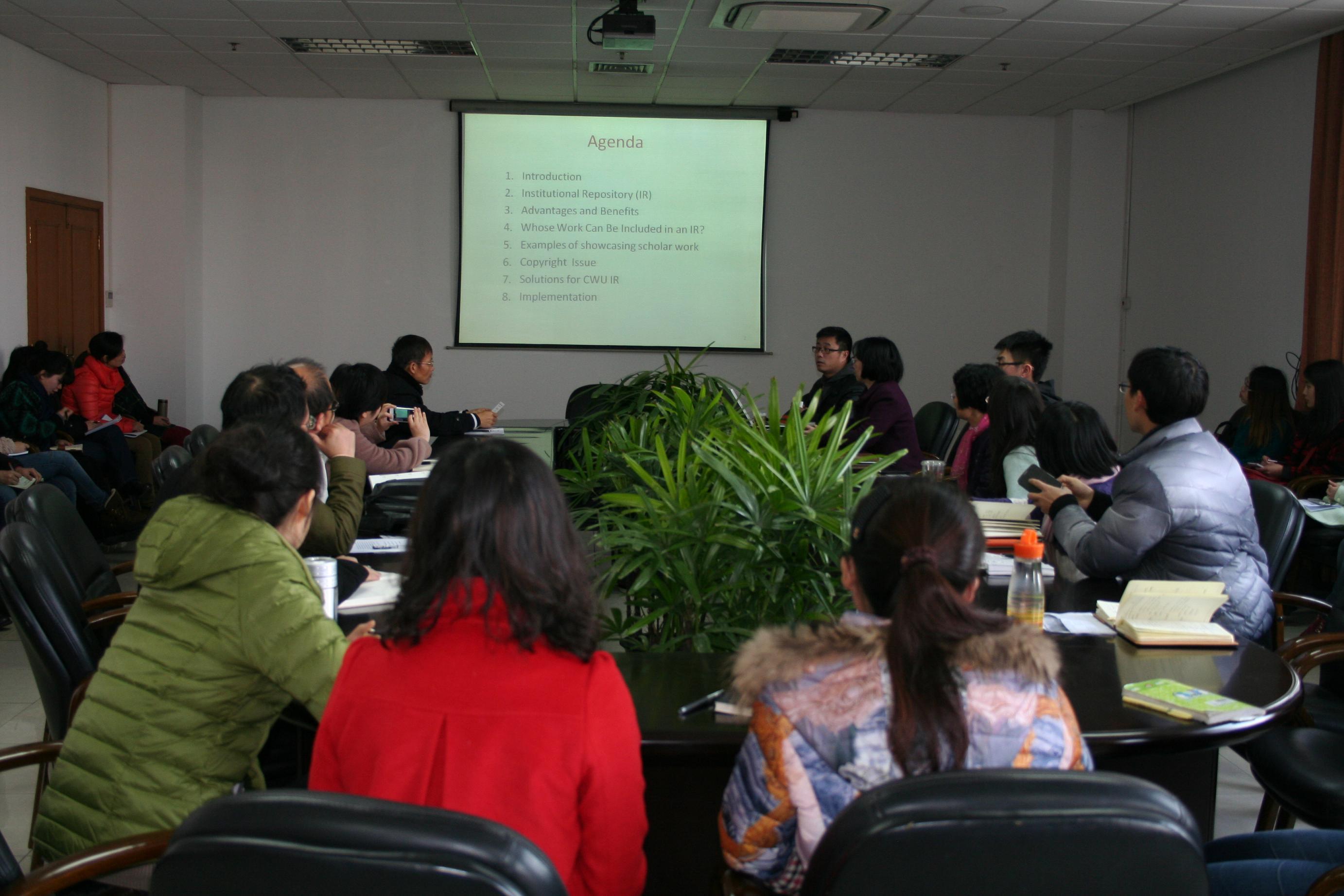 2014年3月14日上午,应金沙集团1862cc成色图书馆邀请,美国中央华盛顿大学(Central Washington University)图书馆系统部总负责人傅平先生前来校图书馆作《机构库服务与发展》学术报公告会,图书馆副馆长刘华主持报告会,馆办公室、资源建设中心、读者服务中心、信息服务中心等部门同仁近40人参加报告会交流,上海地区部分高校图书馆同仁也前来参加交流。