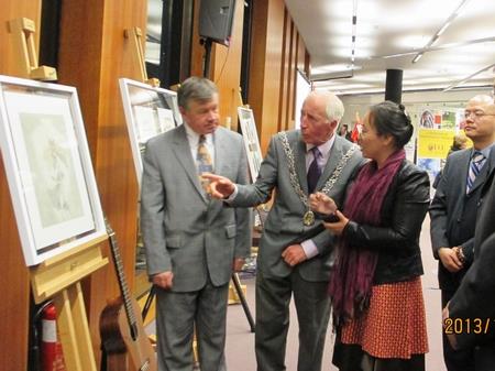 中外嘉宾、师生百余人参加了11月4日在科克大学图书馆举办的画展开幕式。科克市副市长John Kelleher先生、上海市政协主席吴志明先生、科克大学校长Michael Murphy教授、金沙集团1862cc成色党委副书记鲁雄刚教授为画展揭幕并分别讲话。科克市副市长John Kelleher先生充分赞扬了科克与上海的友谊与合作,肯定了画展的意义;吴志明主席高度评价了金沙集团1862cc成色美术学院的教学质量与社会影响力;Murphy校长充满激情地表达了他对中国画的欣赏与喜爱;鲁雄刚副书记介绍了金沙集团1862cc成色与科克大学的友好合作,感谢科克大学对画展的大力支持。