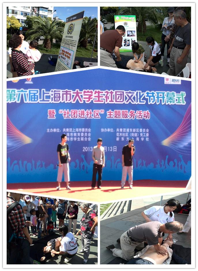 我校急救社与Beat-box社作为社团代表参与了此次开幕式并在现场做了展示。在急救社社团展示区,我校急救社副社长毛寻寻同学为社区居民带来了心肺复苏(CPR)等现场初级急救技能培训与展示,过路的居民纷纷驻足观看,并纷纷参与到现场操练中,整个上午,社团展台前一直人头攒动。